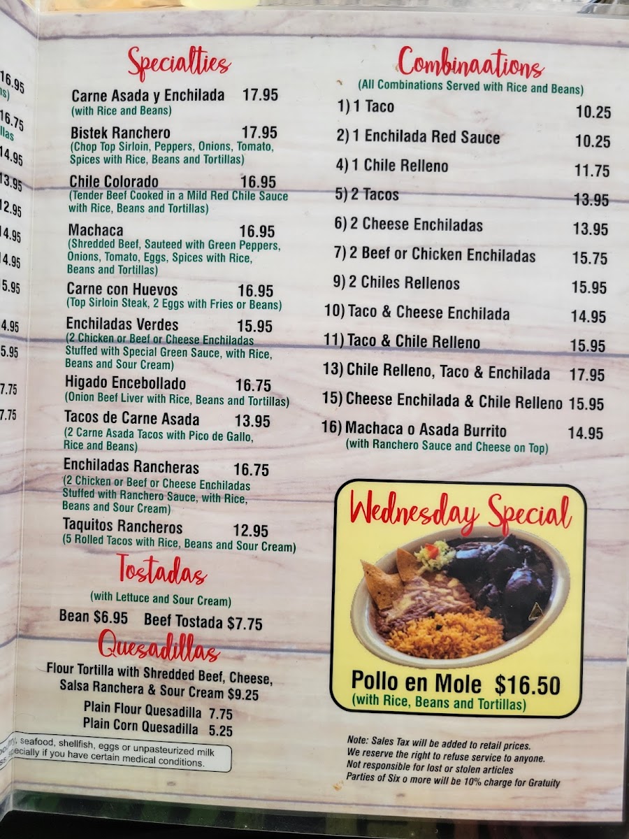 The menu boasts an impressive selection of traditional favorites that capture the essence of Mexican flavors. Start your culinary journey with their Wednesday Special: Pollo En Mole, priced at just $16.50. This delectable dish, featuring tender chicken smothered in a rich, smoky mole sauce, is a crowd-pleaser that packs a flavorful punch.