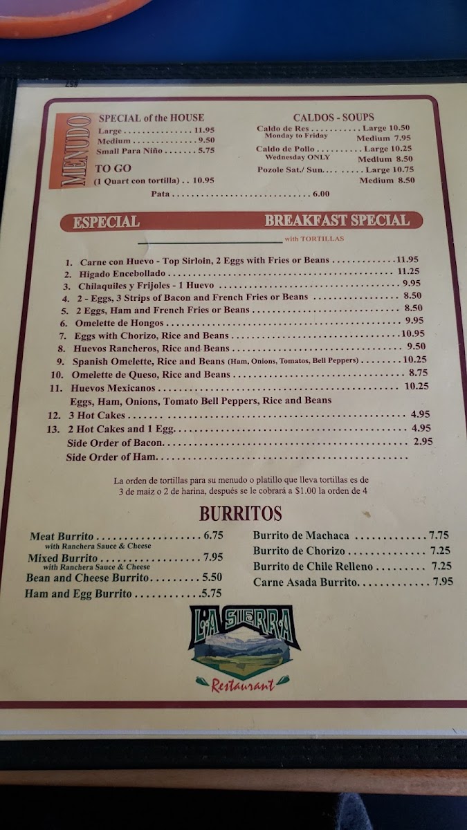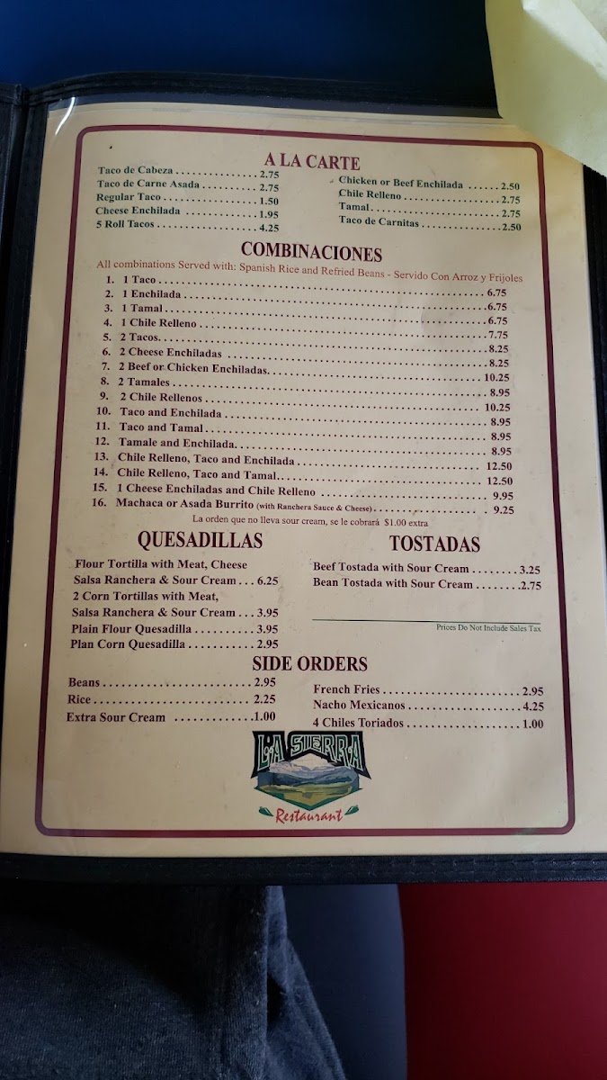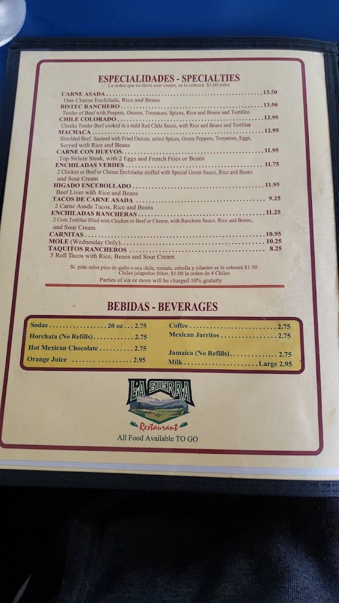 But that's just the beginning. For breakfast lovers, La Sierra Cafe has something for everyone—try the Huevos Rancheros, perfectly paired with rice and beans, or dive into the hearty Taco And Enchilada combination for a satisfying meal any time of day. Can’t decide? Opt for their combinaciones that let you explore multiple flavors in one meal, such as two Chile Rellenos or a Machaca Burrito loaded with savory goodness.